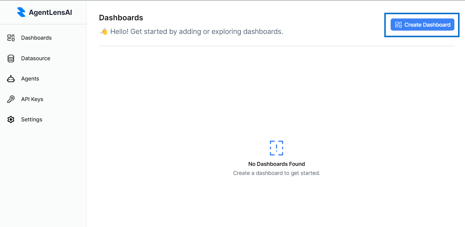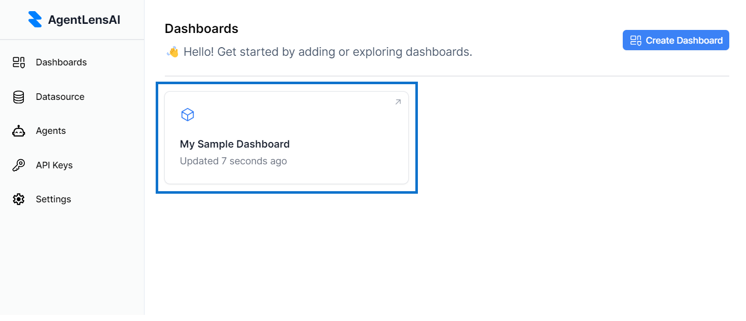 AgentLensAI allows you to create and manage your dashboards. You can create a fully interactive dashboards and start adding live charts / graphs based on your data.